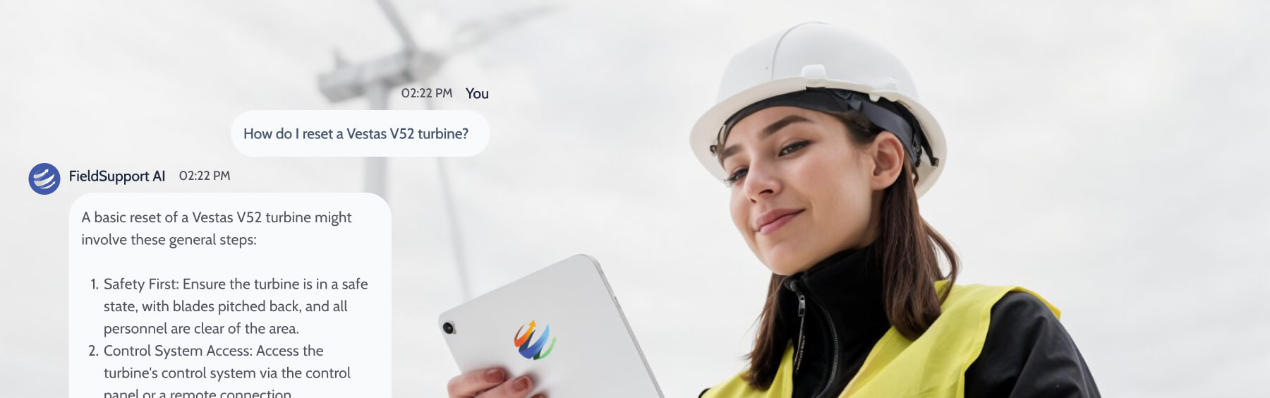 Get immediate answers to your technical questions with our FieldSupport AI Chatbot. 💡 Designed specifically for the renewable energy industry, this powerful tool provides instant assistance on key wind and solar technologies. Whether you need troubleshooting advice, maintenance tips, or operational guidance, our AI Chatbot is available 24/7 to support your team.